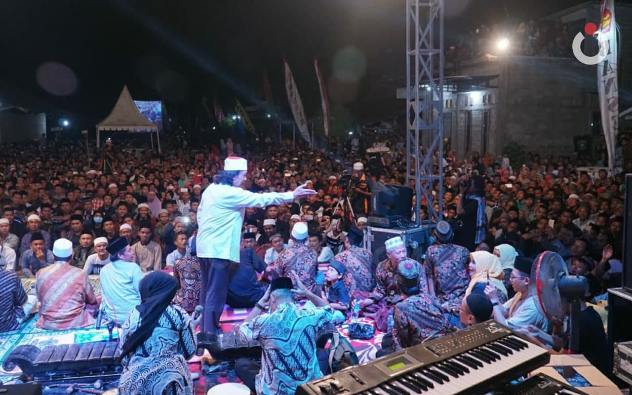 “Dari depan panggung pemandangan kerumunan orang semakin jelas. Sebuah rumah tingkat dua terlihat balkonnya penuh dengan orang. Di sisi kiri panggung, segerombolan anak muda terlihat sampai memanjat dinding pagar. Kemudian, dalam hitungan seratus meter dari panggung jamaah duduk lesehan, panggung terlihat jauh. Maka, sebagian jamaah mengikhlas diri berdiri menyimak acara melalui layar proyektor.”