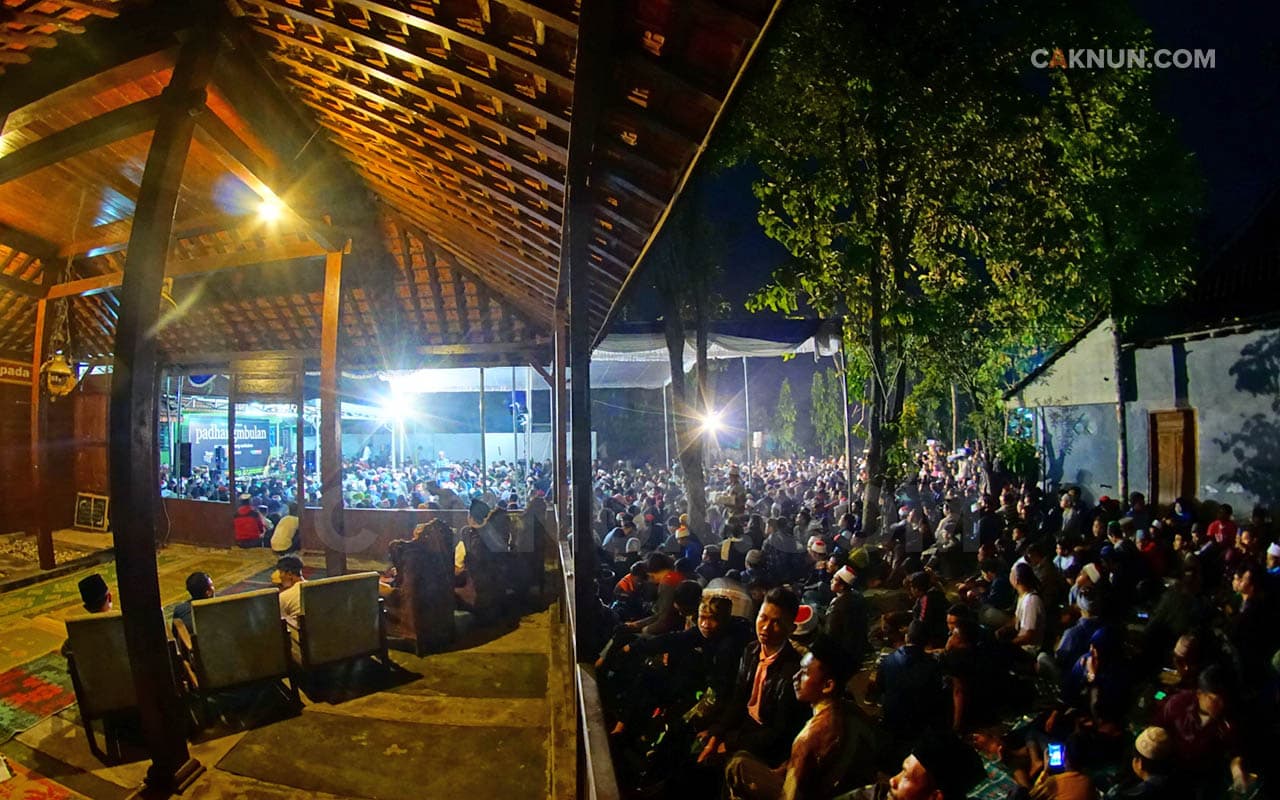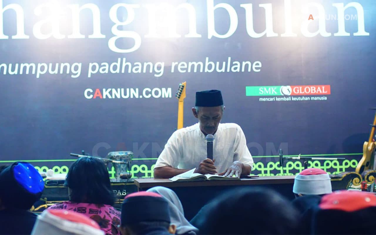 Sesaat kemudian Mbah Nun rawuh. Kami bersalaman. Di panggung Padhangmbulan bapak Abdullah Qoyim darusan membaca  Al-Qur`an. Suasana di teras ndalem kasepuhan hening. Mbah Nun menyimak ayat-ayat yang dibaca. Mata beliau seperti membaca sesuatu.
