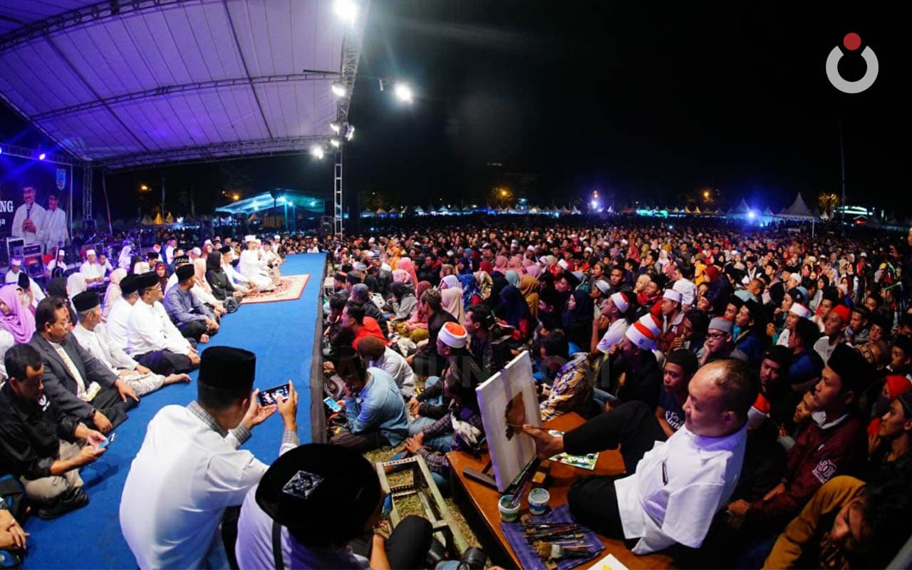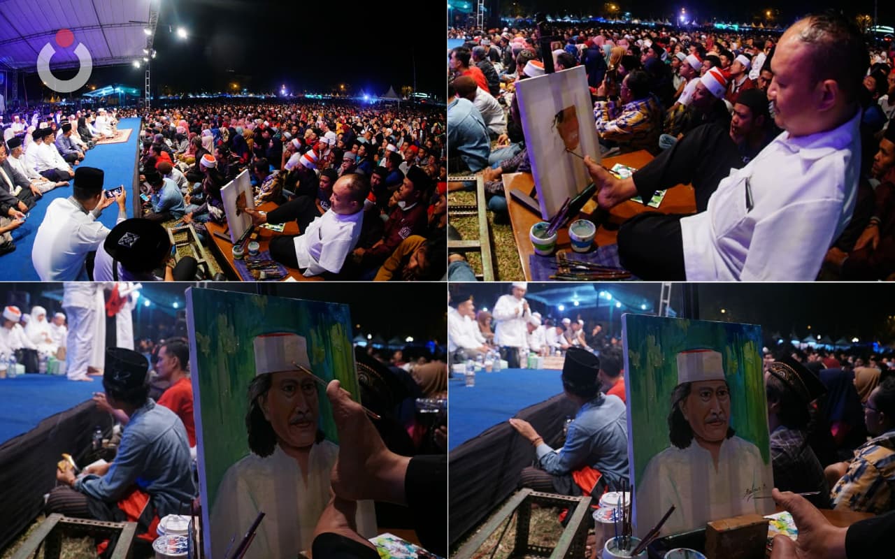 Bahkan ada seorang seniman lukis, yang mohon maaf tidak memiliki tangan, hadir malam ini, dan di tengah-tengah Jamaah sembari mengikuti Sinau Bareng, Ia bentangkan kanvasnya, Ia lukis wajah Mbah Nun.