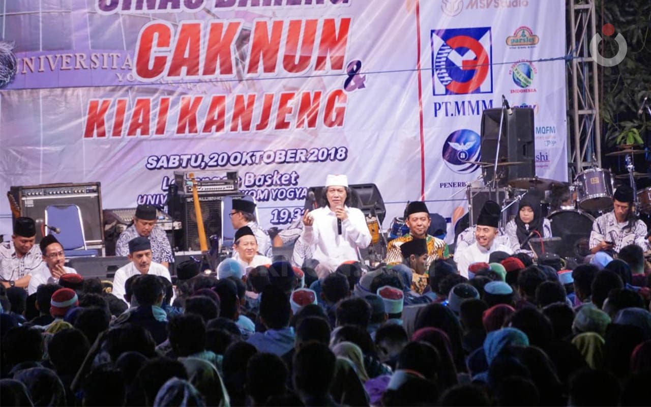 Puncak kemesraan Sinau Bareng disempurnakan dengan kegembiraan Medley Era. Semua yang di panggung ikut urun, diberikan secarik lirik dan diajak ikut bernyanyi. Lelaki muda yang tadi bertakbir-takbir sebelum bertanya, paling aktif berjoget. Adik mahasiswa kita yang hobi diskusi dengan diri sendiri tadi, masih datar-datar saja. Memegang mikrofon dan membaca liirik lagu dengan serius seperti sedang memecahkan teori maha pelik. Saya agak membatin, “Senyum Mas, senyum sedikit saja, itu sudah sangat menghibur.” Tapi rupanya bagi orang-orang yang duduk di belakang dan menikmati sajian dari layar besar, tingkah serius adik mahasiswa kita ini justru yang paling menghibur. Tiap sosoknya kena sorot kamera, orang-orang terpingkal-pingkal, betulan ini bukan tawa merendahkan. Hanya kontras saja.