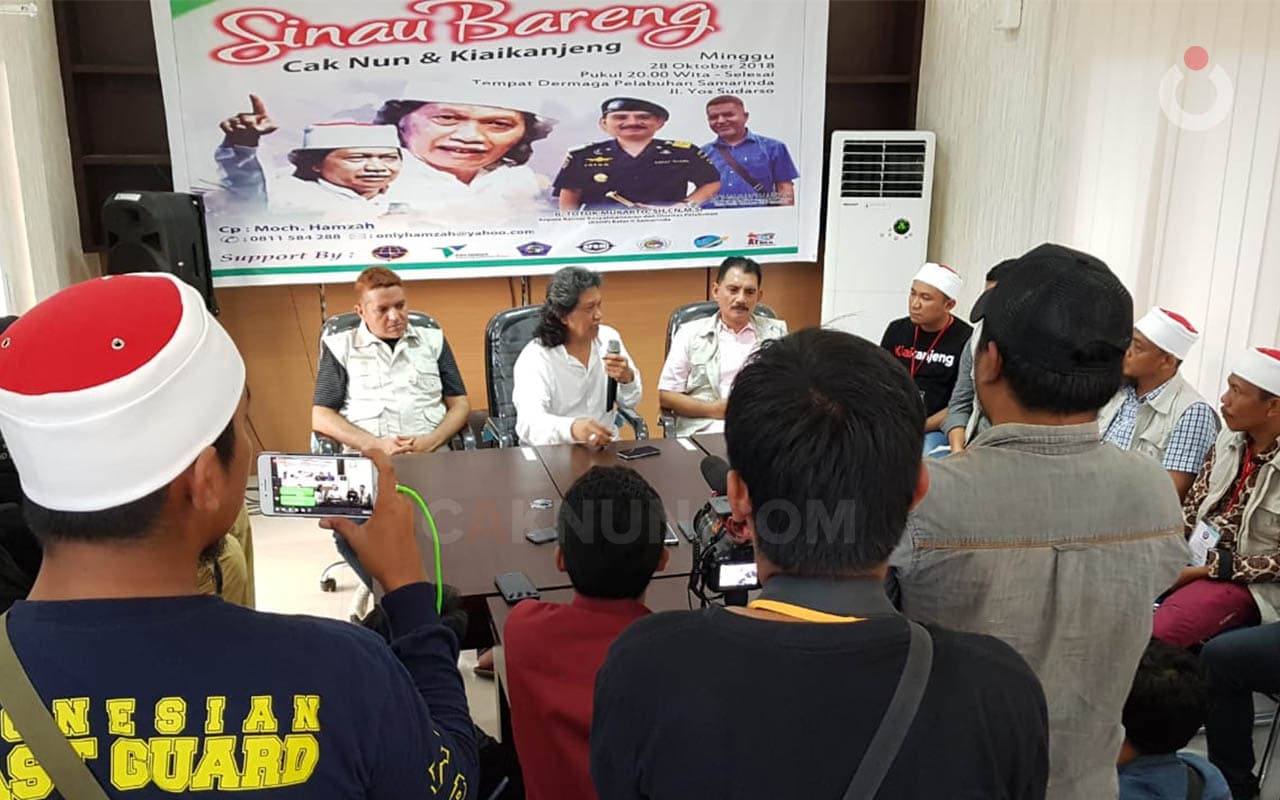 Serangkai dengan persiapan Sinau Bareng nanti malam (28/10) di Dermaga Pelabuhan Samarinda, siang tadi bertempat di lantai 2 Kantor KSOP Kesyahbandaran dan Otoritas Pelabuhan (KSOP) Samarinda, panitia mengundang wartawan dari berbagai media nasional dan lokal untuk konferensi pers dan bertemu dengan Cak Nun.