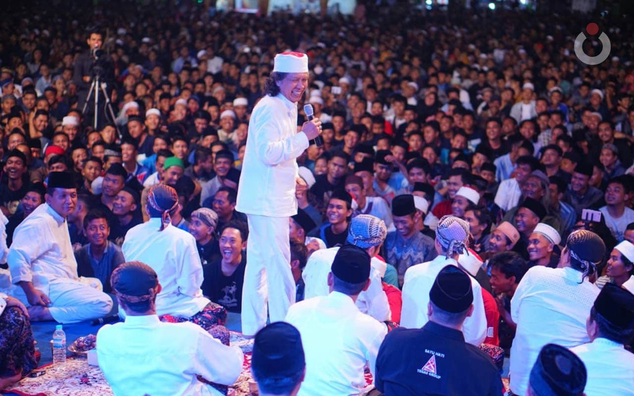 Hati yang gembira, hati yang selesai, hati yang selalu terkoneksi dengan Menara Sinyal Yang Maha Kudus. Maka kegembiraan tak pernah luput dalam Sinau Bareng. Lagu bergenre dangdut dibawakan, Mbak Nia menjadi lead vocal. Seorang pria dengan kostum Macan Muria berjogetan di sebelah Mbak Nia. Lepas saja dan nikmat sekali rasanya Mas itu. Mas Urip Utoyo namanya ketika belakangan ditanyai oleh Mbak Nia di panggung. Sudah berkeluarga dan tentu, pedukung sejati Persiku tidak perlu tersipu-sipu dia tegaskan seperti itu.