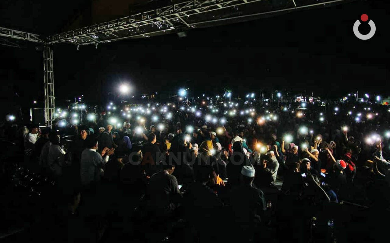 Saya sudah kembali di belakang panggung, membawa sebungkus tahu solet anget untuk dikudap bersama rekan-rekan yang duduk di belakang panggung. Tiba-tiba lampu dan sound system mati, sontak kami semua kaget. Pak Erfan, Mas Pentil, Mas Yudhis, juga Rendra sigap dan langsung mencari sumber masalah. Sementara, Pak Jijit, Mas Doni dan Mas Yoyok KiaiKanjeng, mencoba terus berkomunikasi dan mengajak jamaah dolanan meski tanpa microphone. Tidak mudah membuat suara mereka didengar hingga jarak ratusan meter di depan panggung, namun saya lihat mereka juga Mbah Nun sangat menguasai audiens. Jamaah tertib dan tetap gayeng penuh keakraban mengikuti setiap arahan mereka bertiga. Susah digambarkan dengan kata-kata kondisi saat itu, syahdu, atau entah apa kata di atasnya, Saya belum menemukan.