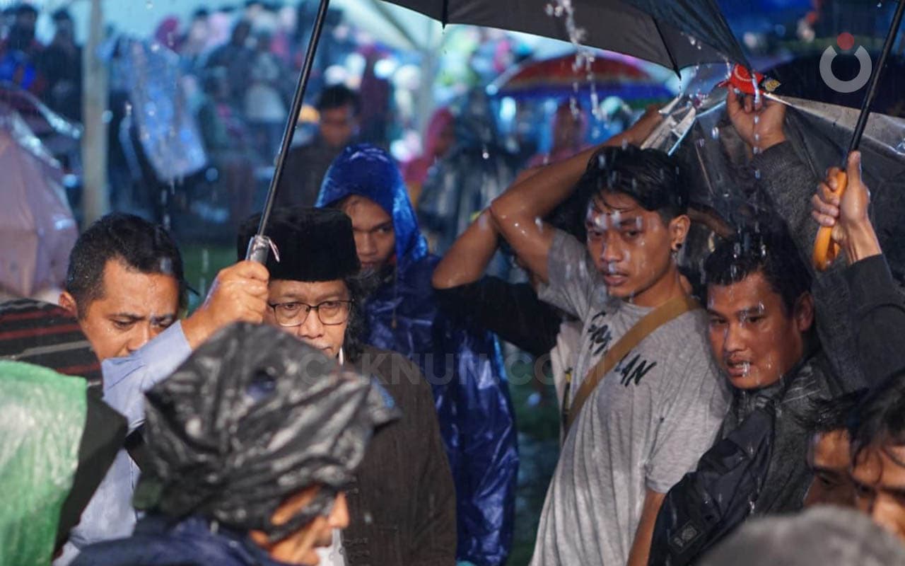 Terlalu asik mengetik, pelapor reportase yang sambil neduh di belakang ini tiba-tiba tersadar bahwa di sekelilingnya orang sudah menggelar kesiapannya masing-masing. Dia berdiri menjulang sendiri, dan jadi malu sendiri karena ternyata menghalangi sekeluarga yang duduk tepat di belakangnya. Cukup malu, maka dia akhiri reportasenya agar bisa mencari posisi yang lebih strategis untuk menyerap Sinau Bareng kali ini. Dari panggung ada kalimat “Kagem Kiai Kanjeng kulo sumanggaaken” atau semacam itu. Shalawat Badar melantun. Hujan mendera deras! Reportase singkat pun diakhiri dengan kalimat, malam ini menyenangkan.