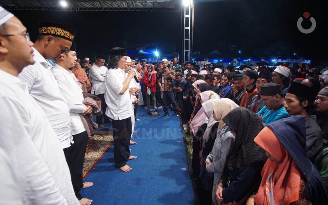 Salah satu tradisi yang rasanya baru ada di majelis-majelis Maiyah adalah ketika pada akhir acara Mbah Nun menggelorakan “innama amruhu idzaa arooda syai’an an yaquula lahu...” dan para hadirin menjawab dengan seruan: “Kun fayakun!” Seorang mbah putri, sambil meneduh karena gerimis mulai hadir. Menatap panggung dari kejauhan, menangkupkan tangannya entah memendam doa apa. Karena ini tradisi di mana permintaan pada Sang Khaliq tidak diseragamkan oleh kelas agamawan, tapi semua individu berhak connect langsung dengan Sang Maha Pengabul Permintaan. Mbah Putri yang berkebaya biru itu tampak ingin sekali ikut bersorak namun tubuh yang ringkih tidak mengizinkan sehingga tampak tubuh mungil beliau saja yang bereaksi, “Kun fayakun.” Hanya lirih namun tangannya mengembang ke atas, seperti ingin menggapai ke langit. Ke masa depan?