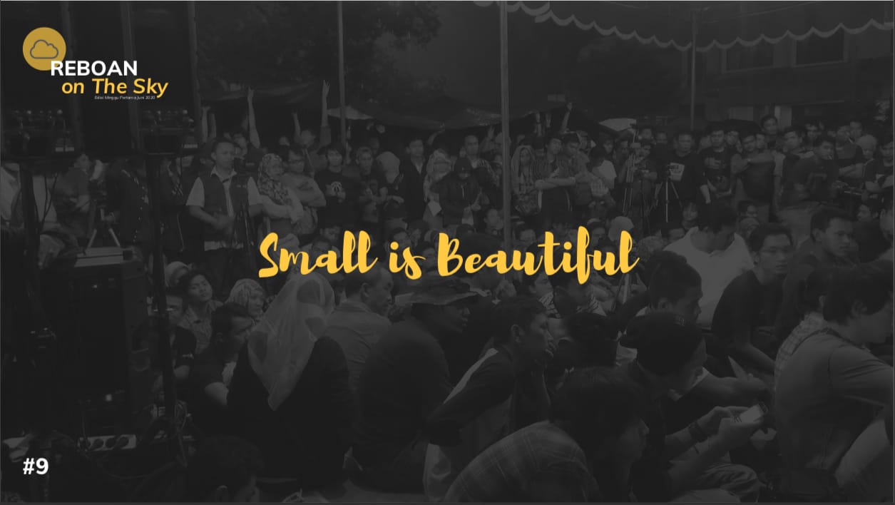 Reboan on the Sky minggu ini (10/06) topik diskusi yang diangkat adalah seputar Small is Beautiful, sesuai anjuran Yai Tohar. Ternyata buku yang berusia hampir setengah abad itu masih cocok dipelajari.
