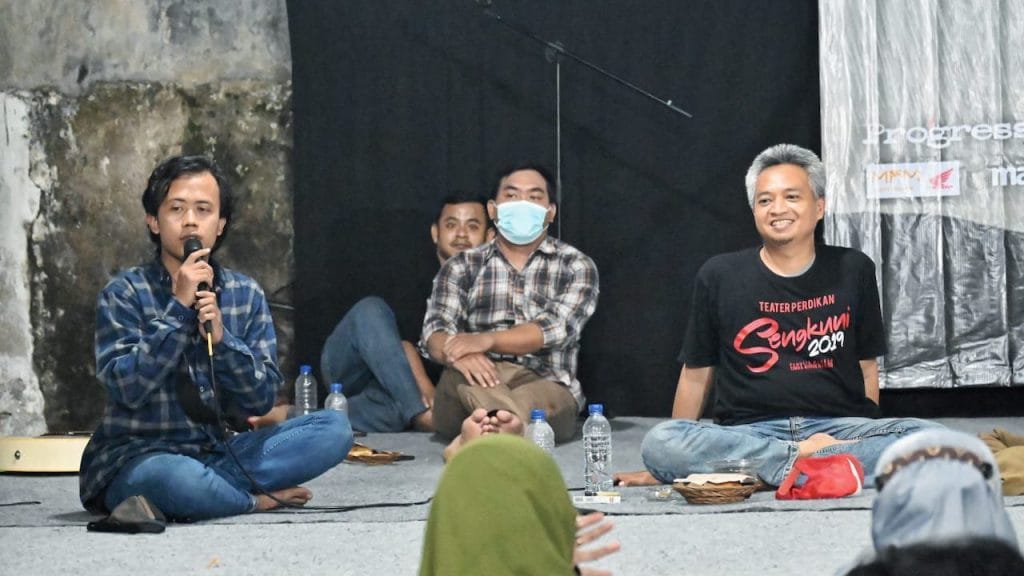 Sebelum menuju pembahasan inti yang akan dibersamai Mas Sabrang, Mas Acang, dan Mas Aminullah, Girikustik membawakan nomor dari Dewa 19 untuk mengiringi perjalanan para narasumber dari transit menuju panggung membersamai kita sinau malam itu. Girikustik ini adalah sekumpulan pemuda yang berteman sejak SMA dan sama-sama punya hobi bermusik.