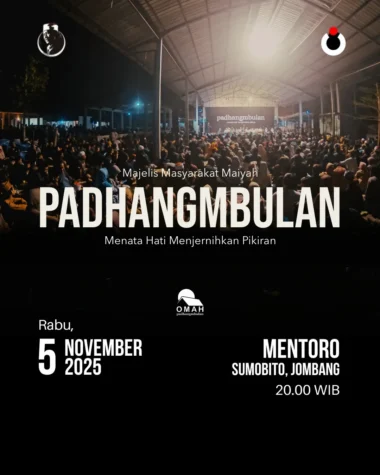 Lalu lahirlah baris-baris yang paradoksal: “Kelemahan menyimpan berlimpah kekuatan, buta mata menganugerahi penglihatan.” Kita belajar di Maiyahan bahwa realitas selalu bersifat ganda namun padu dan berjodoh: di balik setiap kelemahan tersembunyi kekuatan, di balik kehilangan tersimpan penemuan, di balik kesulitan ada kemudahan. Allah mentajalikan diri-Nya tidak hanya dalam terang, tetapi juga dalam misteri kegelapan dan ketidaktahuan. Maka “buta” di sini bukan kutukan, melainkan cara lain untuk melihat—melihat dengan mata hati, bashirah, bukan mata kepala semata.