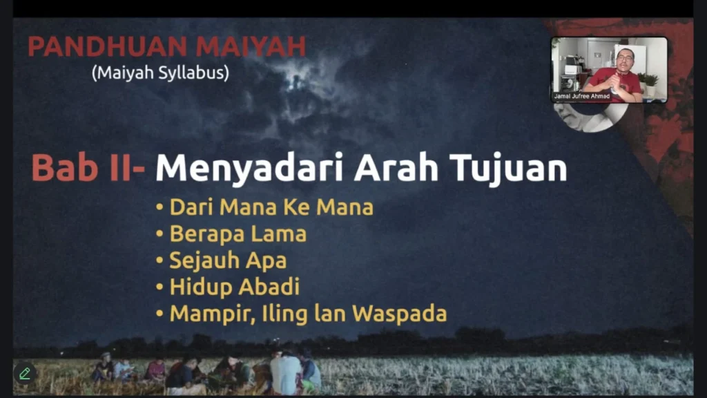 Tibalah pada inti diskusi, Mas Jamal menampilkan slide yang berisi silabus Maiyah. Silabus ini terbagi dalam lima bab. Menurut Mas Jamal, bab itu asalnya dari bahasa Arab yakni ‘babun’ yang berarti pintu. Namun, kita telanjur mengidentikkan dengan terminologi barat yakni chapter yang bermakna unit atau bagian.