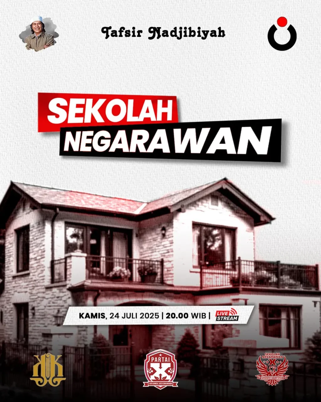 Karenanya, dalam setiap acara Tafsir Nadjibiyah persembahan Partai X, kita selalu menyimak analisis dan pandangan Partai X tentang struktur politik, situasi politik, dan masalah-masalah politik di Indonesia yang bersumber dari tidak adanya pemilahan yang tegas antara ranah negara dan ranah pemerintah.